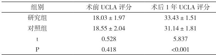 修复手术前,所有患者的 UCLA 评分对比,没有明显差异性,P>0.05,无统计价值。修复后 1 年,两组患者的UCLA 评分均有所提升,尤其是研究组患者的UCLA 评分提升幅度更大,与修复后的对照组比较,P<0.05,差异存在统计价值,详细数据如表1 所示。