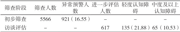 此次筛查样本共 5566 人,其中异常人数 921 人,占比 16.55%,有 617 人接受进一步访谈评估,确定轻度认知障碍135 人,占比21.88%,中度及以上认知障碍 65 人,占比 10.53% 。详细数据见表 1。