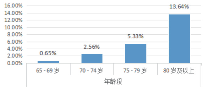 年龄是老年性痴呆发病的一个重要风险因素,65 岁以上群体发生率会随着年龄增加而逐渐升高。本次数据分析发现,65-69 岁人群疾病发生率为 0.65%,70-74 岁人群疾病发生率为 2.56% ,75-79 岁人群疾病发生率为5.33%,80 岁及以上群体疾病发生率最高,为13.64%。详细数据见图 1。