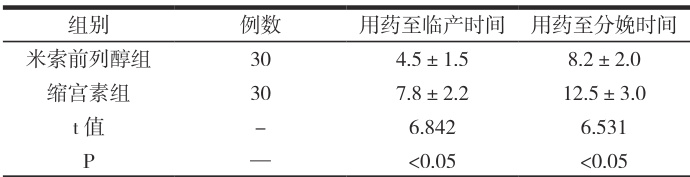 用药至临产时间、分娩时间方面,米索前列醇组短于缩宫素组,差异有统计学意义( P<0.05 ),表明引产效率高见表1。