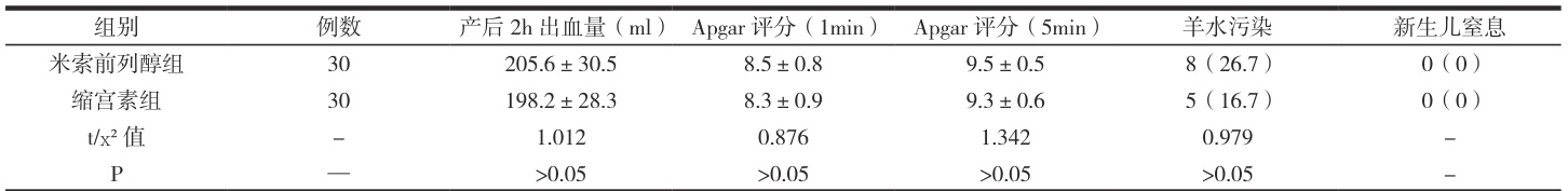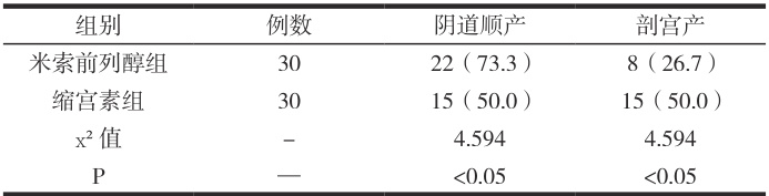米索前列醇组阴道顺产率高于缩宫素组,剖宫产率低于缩宫素组,差异有统计学意义( P<0.05 ),见表2。