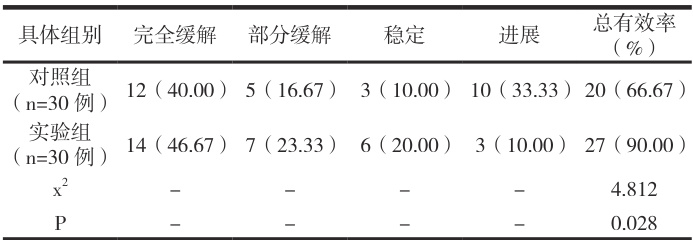 根据电脑随机法指导,将 2024 年 2 月至 2025 年 2 月我院收入的弥漫大 B 细胞淋巴瘤患者分组,具体包括:对照组、实验组,两组共计 60 例,详细分析如下。对照组:纳入 30 例,性别分布中,女患、男患统计后为12 例、18 例,年龄调查后,上限值78 岁,下限值54 岁,平均数值( 66.09±2.11 )岁;实验组:纳入30 例,性别分布中,女患、男患统计后为13 例、17 例,年龄调查后,上限值77 岁,下限值56 岁,平均数值( 66.48±1.95 )岁。上述研究资料无差异, P>0.05 。