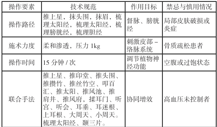开天门手法操作具有明确的解剖定位和操作规范 。具体操作路径为:前额发际至两眉间连线中点(传统经络中的督脉和膀胱经区域)。标准操作手法为:施术者以双拇指指腹在此区间自下而上交替直推,力度要求“稳中有劲、柔中带刚”,频率维持在 60-80 次 / 分钟,每次持续 10-15 分钟。在临床应用中常与其他手法联合形成“复合手法”:包括推太阳(颞部少阳经区域)、推坎宫(眉弓上方)以及按揉百会穴等,形成系统的头面部推拿治疗方案。