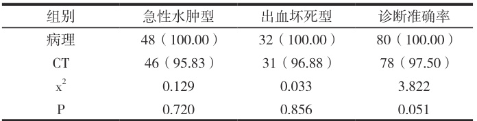 对出血坏死型、急性水肿型的诊断准确率予以比较;按照疾病类型和分级,明确检查结果,A 级指的是胰腺组织不存在病变表现;B 级指的是胰腺组织有炎症反应,有胰腺组织弥漫性肿大的现象,在检查中可见胰腺周围组织处在正常现象;C 级则是炎症反应严重,胰腺组织存在弥漫性肿大,CT 检查则说明脂肪结缔组织有炎症反应;D 级则是弥漫性肿大严重,炎症反应严重,CT 检查下可见有胰腺实质积液现象,有炎性病变的状况。E 则是胰腺组织坏死,且有单发性积液表现。