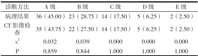 表 2 中知晓,无论哪一分级,CT 诊断方式和病理检查结果比较,均无统计学意义, P>0.05 。