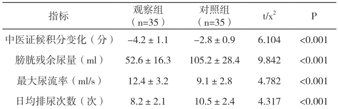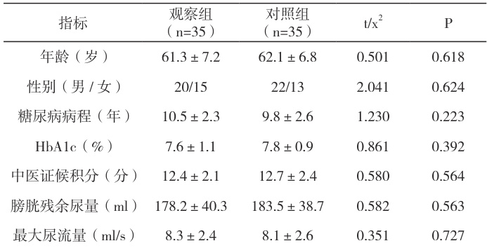 研究最终纳入 70 例患者(观察组 35 例,对照组 35 例),两组年龄、性别比、病程、HbA1c 水平、中医证候积分及尿动力学参数(膀胱残余尿量、最大尿流率)均无统计学差异(P>0.05),组间可比性良好。见表1。