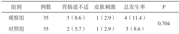 两组不良反应发生率无统计学差异(观察组 11.4% vs 对照组 8.6% ,P=0.704)。不良反应均为轻度胃肠道不适(观察组 3 例、对照组 2 例)及皮肤刺激感(观察组 1 例,对照组 1 例),未影响治疗进程。见表3。