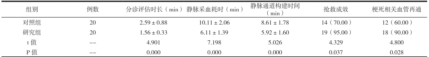 (1)救治时效:记录分诊评估时长、静脉采血耗时、静脉通道构建时间。(2)救治成效:统计 2 组梗死相关血管再通人数和抢救成功的人数。