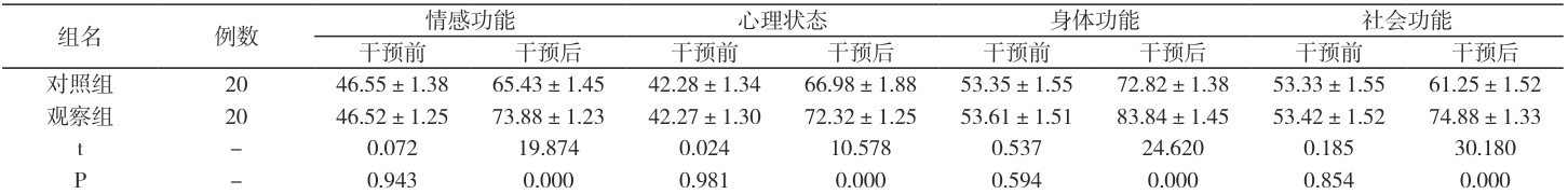 如表 2,干预前生活质量指标评分对比无统计学意义( P>0.05 ),干预后,观察组的评分高于对照组( P<0.05 )。