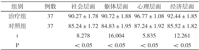对比分析治疗组及对照组护理后生活质量,共包括:躯体健康、心理情绪、社会功能以及经济能力。分数越高,表明质量越高。