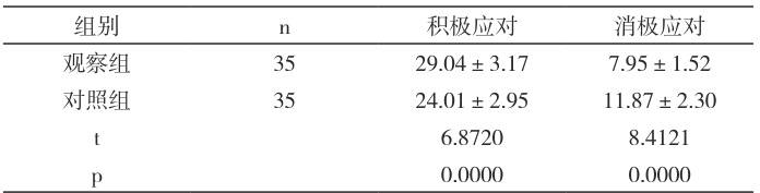 应对方式。采取的评估工具为简易应对方式问卷(SCSQ),以SCSQ- 积极应对评分越高越好(总分 36),SCSQ- 消极应对评分越低越好(总分24)为评估标准[2]。