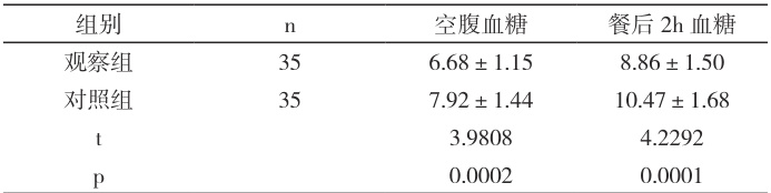 观察组空腹与餐后2h 血糖更低, p<0.05 ,见表 2。