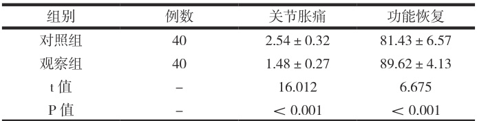 康复效果,关节胀痛(取VAS 量表,0\~10 分表示无痛和剧烈疼痛)以及功能恢复(取FMA 量表,0\~100 分表示运动功能障碍与无障碍)。