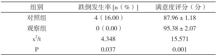 如表 1 数据,观察组患者的跌倒发生率相较于对照组,明显更低,其满意度评分较对照组高, P<0.05 。