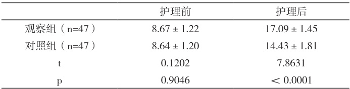 应用自我效能评定量表对比观察两组患者的自我效能评分,评分越高,说明自我效能越好。