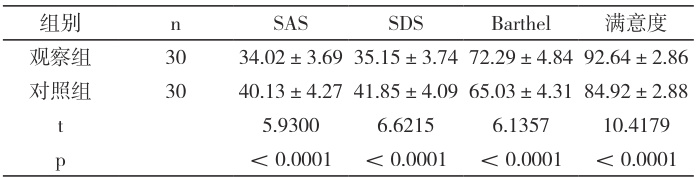 采用抑郁、焦虑评定量表(SAS、SDS)、Barthel 指数评分及我院自制的满意度调查问卷对比观察两组心理、生理康复质量及满意度。