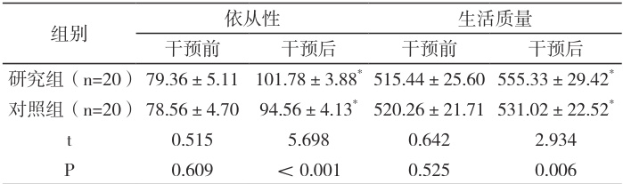 依从性、生活质量比较,2 组均升高,且研究组升高明显(P<0.05 ),见表2。