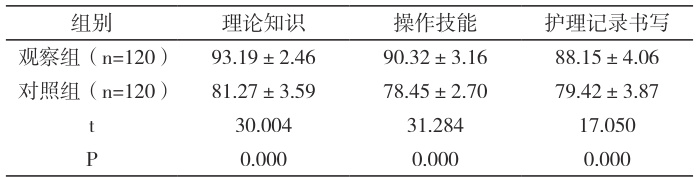 观察组护生的各项考核成绩,均显著高于对照组( P<0.05 )。见表1 :