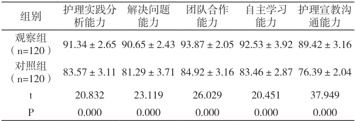观察组护生的各项综合实践能力评分,均显著高于对照组( P<0.05 )。见表2 :