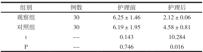 护理前观察组与对照组疼痛评分无显著差异( P>0.05 );护理后,观察组疼痛评分为2.12 分,显著低于对照组的4.58 分( P<0.05 )。