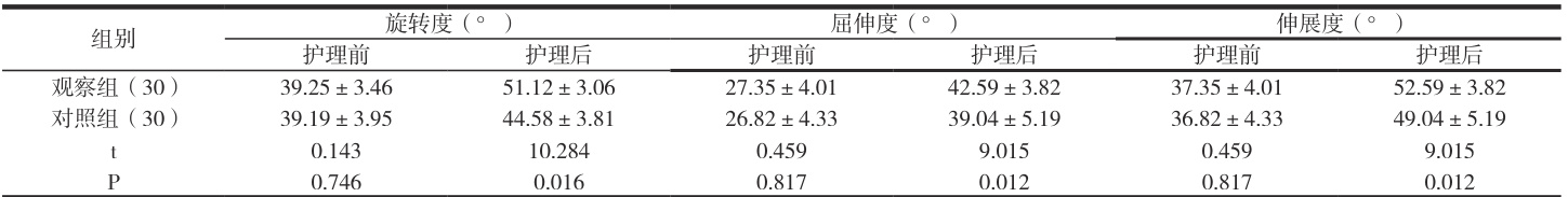 护理前,两组颈椎旋转度、屈伸度、伸展度无显著差异( P>0.05 );护理后,观察组各项指标均显著优于对照组( P<0.05 )。