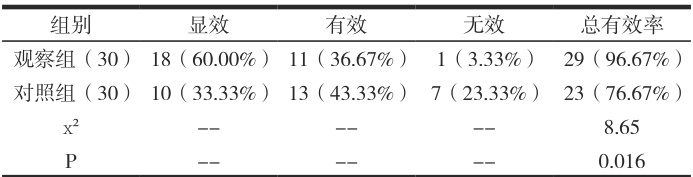 观察组总有效率为 96.67% ,显著高于对照组的 76.67% ( P<0.05 )。