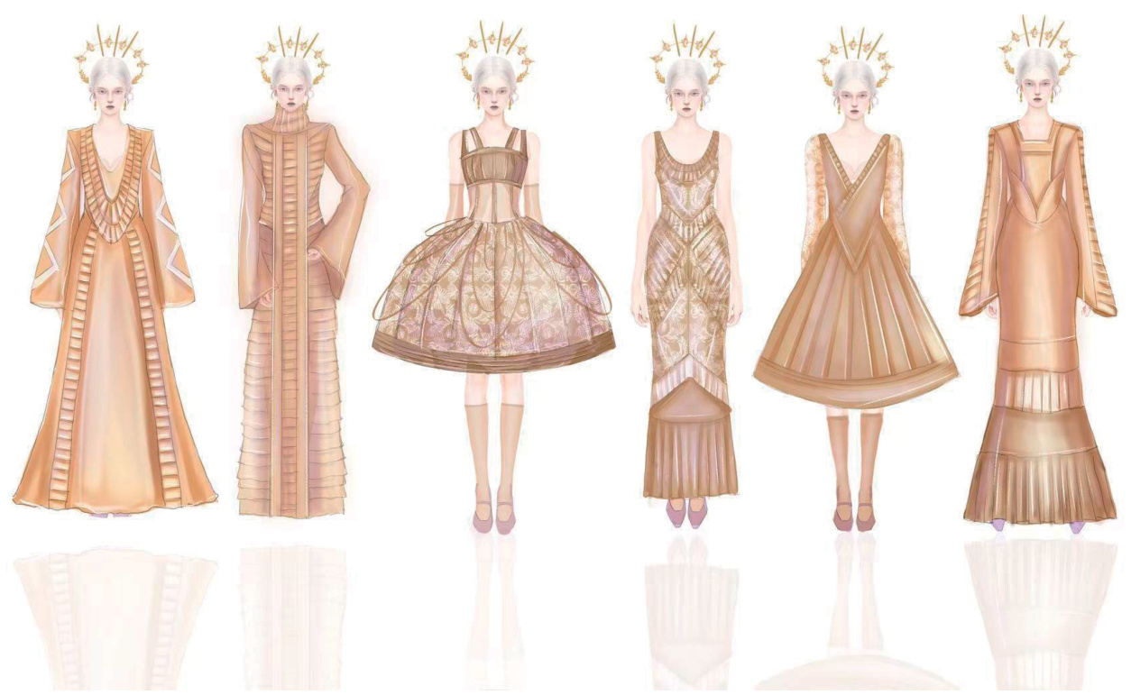 作品简介:设计作品为重工串珠刺绣配饰和其人工智能衍生品。包身材料采用真丝、硬纺衬,装饰材料为印度线、亚克力切割珠、水钻链条、米珠、金属片。