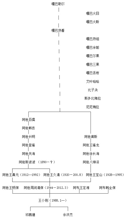 为了使传承谱系更加清晰,笔者根据王小刚的口述,将传承谱系整理成关系图,便于直接了解王小刚释比这一支的乐舞传承关系脉络,如下图: