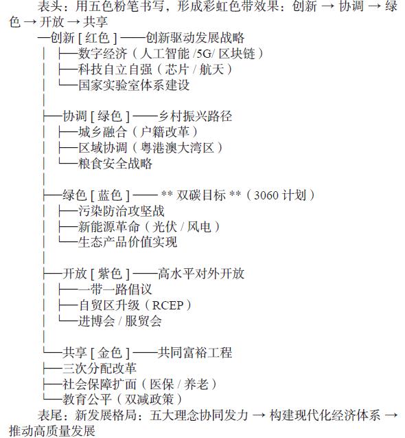 高三年级学生工作记忆容量较少,通过“由少到多”的逐步呈示实现认知负荷的降低。教师在《新发展理念》的复习课教学中,应用了“总—分—总”板书设计,以动态图呈现,一方面让黑板的信息呈现有一定的留白,另一方面让学生的观察能力伴随着视觉层次实现进阶,在没有 PPT 教学生态下,学生认知负荷比单纯 PPT 教学降低 42% 。具体如下: