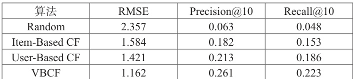 实验结果表明,VBCF 算法的 RMSE 值较传统 User-Based CF降低了 18.2% ,在评分预测准确性方面有显著提升。同时,在 Top-10 推荐质量方面,VBCF 的 Precision@10 和 Recall @10 分别达到0.261 和 0.223,相比 User-Based CF 分别提升了 22.5% 和 19.8% 。