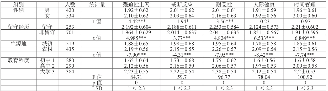网络成瘾在是否有留守经历对照比较中,有留守经历的青少年在网络成瘾各个维度上得分均显著高于留守儿童。
