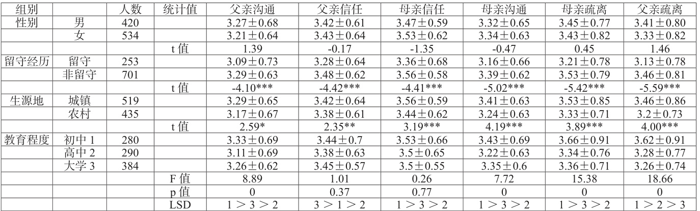 不同受教育程度的青少年亲子依恋得分在父亲沟通、母亲沟通、母亲疏离和父亲疏离维度上的差异具有统计学意义 (P<0.05) ,通过进一步多重比较发现,初中学生在父亲沟通、母亲沟通、母亲疏离和父亲疏离维度上得分均显著高于高中和大学学生;大学学生在父亲沟通、母亲沟通、母亲疏离维度上得分显著高于初中生,且在父亲疏离维度上低于初中生。