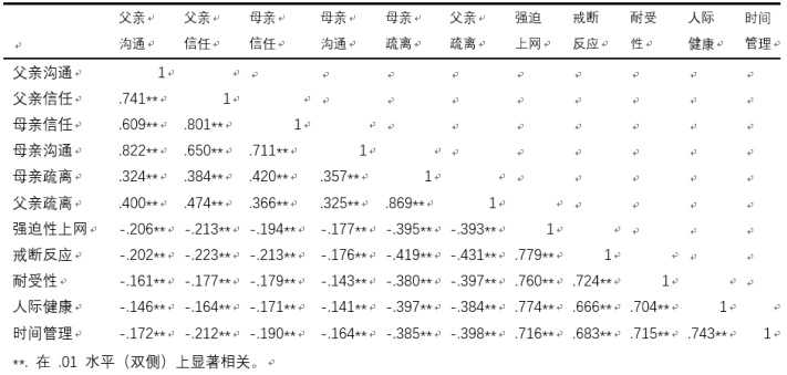 由图 1 可知,亲子依恋的各维度和网络成瘾的各维度负相关,且差异具有统计学意义。