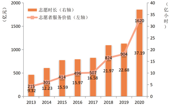 志愿服务贡献价值是由志愿者参与志愿服务时长折算获得,反映提供无偿志愿服务的劳动人口在社会服务行业中所贡献的经济价值。国际劳工组织推荐使用的计算方法是“替代成本计算法”即志愿服务贡献价值 Σ=Σ 社会服务行业(社会组织)雇员平均工资(元 /小时) × 志愿服务小时数。