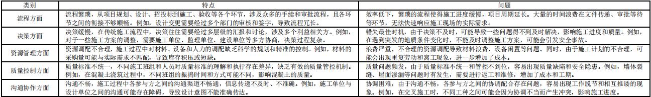 统建筑工程施工流程具有鲜明的特点,同时也存在诸多问题,以下通过表格进行详细对比分析: