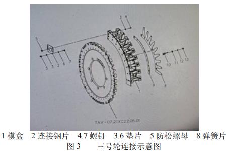 YB28 包装机三号包装轮是由四组扇形模框(每组 9 个模盒)组成,(如图 3)模框内侧通过 M8 的螺钉固定安装于三号包装轮架上,外侧用连接钢片两两连接固定在一起组成的垂直安装逆时针旋转的圆形商标纸包装轮。连接钢片通过四个 M4 内六角螺钉由内向外伸出,用四个 M4 防松螺母锁紧,使四组扇形模框组成的圆形的三号包装轮外表面处于一个平面。通过结构分析可以看到,连接两相邻模框的钢片是通过四颗 M4 的螺钉连接并用M4 的防松螺母紧固,并且安装空间狭窄,拆卸工具活动范围小,且螺钉易打滑连轴转,要松开取下或安装此连接紧固螺钉十分困难,费时费力,每次完成此项工作,通常需要两个多小时,效率十分低下。