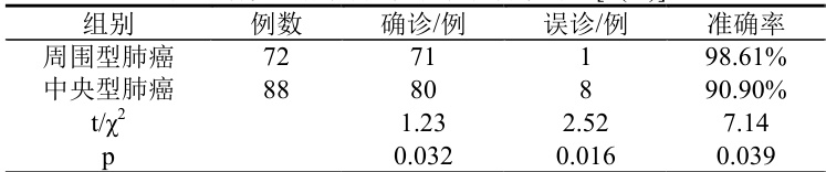 多层螺旋 CT 扫描过程中,明确周围型肺癌例数 71 例,其中 1例微针。对于中央型肺癌共88 例,经过诊断确定80 例,有8 例为误诊,对比两种类型的肺癌疾病的诊断,有明显的区别。这表明对患者疾病诊断期间,单独运用多层螺旋CT 扫描,对于中央型肺癌的诊断有较高的漏诊率,应根据患者实际联合其他诊断,这样能够提升诊断诊断性,如表3。