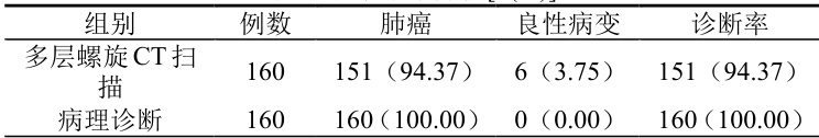 对于本次选入的调查目标进行了临床诊断分析,通过对患者进行多层螺旋CT 扫描,分享结果显示肺癌病患是151 例,与病理诊断结果对比,无较大差异性 P <0 . 0 5 ),如表2。
