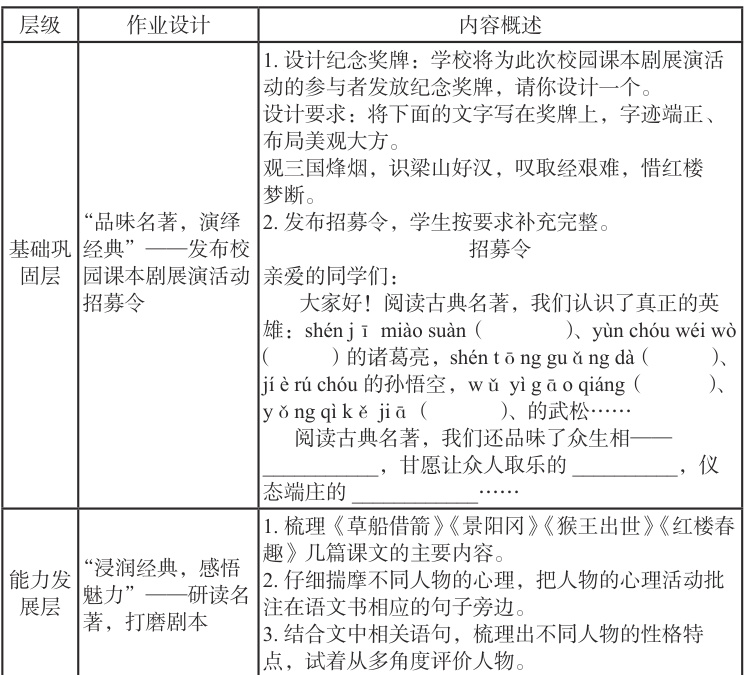 根据学生的学习能力和水平,设计不同层次的作业,让每个学生都能在自己的能力范围内得到发展。部编版小学语文五年级下册第二单元的人文主题是“走近中国古典名著”,这是小学阶段第一次集中安排古典名著的学习,学生理解内容有一定难度,本次作业以“读古典名著,品百味人生——校园课本剧展演活动”为情境任务驱动,旨在让阅读古典名著变得有趣、贴近学生生活。