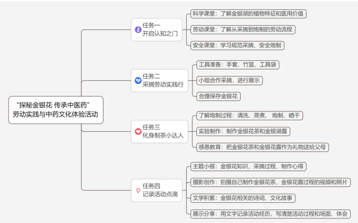 本次实践作业和科学、劳动等学科结合,学生在知识、技能和情感态度方面都取得了长足的进步。他们不仅学到了金银花的专业知识和制作技能,还提升了观察、实践、创新等多种能力。通过劳动实践,学生们更加热爱劳动,懂得珍惜劳动成果;对中医药文化的深入了解,增强了他们对传统文化的认同感和自豪感,激发了传承文化的责任感。