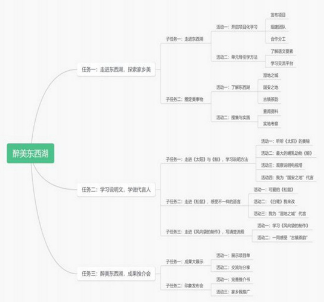部编版五年级上册第四单元是说明文,我们创设“醉美东西湖”项目化学习。这个项目化学习是语文、科学、数学、美术让学生走进大自然,走到东西湖的人文景观、大街小巷、角角落落,进行实地考察、资料搜集、尝试用表格、手工作品、视频影音等多种形式,选用合适恰当的说明方法,呈现自己对所介绍事物的观察与探究所得,让思维可视化,锻炼了学生的提取关键信息、高效梳理信息的能力,养成学生好奇心、求知欲,崇尚真知,勇于探索创新的思维品质。