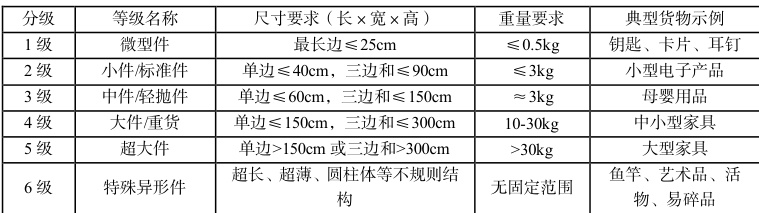 针对电商货物形态差异大的问题,构建支持自定义配置的 6 级分级体系,覆盖从微型件到特殊异形件的全品类货物,分级标准如表 1 所示: