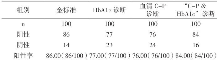 检查结果:比较 HbA1c 单一诊断、血清 C-P 单一诊断、“C-P & HbA1c”诊断阳性率与金标准的差异。