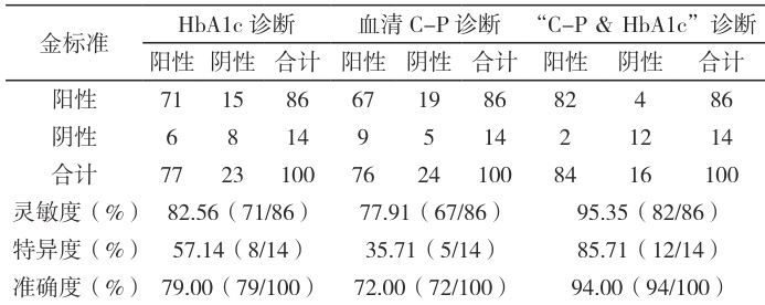 该研究中,“C-P & HbA1c”诊断阳性率为 84.00% ,与金标准阳性率 86.00% 相近,HbA1c 单一诊断阳性率 77.00% 、血清 C-P 单一诊断阳性率 76.00% ,均低于 sC-P &HbA1c”诊断。“C-P & HbA1c”诊断灵敏度 95.35% 、特异度 85.71% 、准确度 94.00% ,与单一检测相比均较高。HbA1c 难以明确血糖波动的原因,但是可以反应一定时间内平均血糖水平。C-P 可以辅助高血糖病理机制诊断,用于鉴别患者属于胰岛素抵抗性高血糖或者胰岛素缺乏性高血糖。糖尿病诊疗中,采用“C-P & HbA1c”诊断方案,有利于在血糖代谢评估中优势互补,提高诊断可靠性。