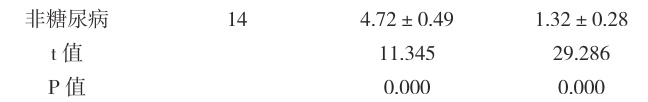检验指标方面,糖尿病患者 HbAlc 、血清 C-P,均较高;非糖尿病者为( 4.72±0.49 ) % 、( 1.32±0.28 ) ng/mL ,非糖尿病者 HbA1c、血清 C-P 无显著异常。2型糖尿病(T2MD)发病早期存在胰岛素抵抗,表现为 C-P 指标增高或者无显著异常,T2DM 病程晚期,随着 β 细胞衰减,患者 C-P 降低。该研究中确诊病例患者血清 C-P普遍增高,同时HbA1c 增高,可以确诊T2DM,联合检测效果较好。