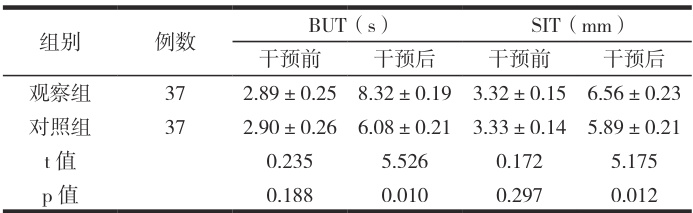干预前两组 BUT、SIT 差异小( P>0.05 ),干预后观察组 BUT、SIT 均高于对照组( P<0.05 )。