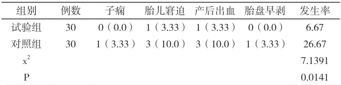 表1 内的不良妊娠结局发生率:试验组 6.67% ,对照组 26.67% ,P<0.05, 。