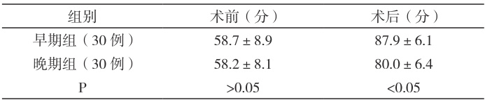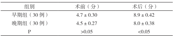 术前,组间病人Lysholm膝关节评分值差异不大( P>0.05 );术后,早期组Lysholm 膝关节的评分更高,组间差异显著( P<0.05 ),如表1。