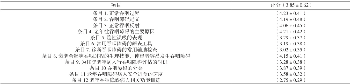 对本次研究 180 份问卷进行汇总,经调查显示广州市某三甲医院护士对老年性吞咽障碍的平均知识维度评分为( 3.85±0.62 )分。