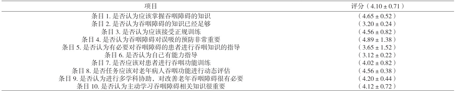 研究调查显示对老年性吞咽障碍的平均态度评分为( 4.10±0.71 )分,呈积极状态,可以看出护理人员对于老年性吞咽障碍的重视度较高,其中单个项目评分较高的分别为:是否认为应该掌握吞咽障碍的知识( 4.65±0.52 )分、是否认为吞咽障碍对误吸的预防非常重要( 4.89±1.38 )分,与张野、魏利等研究结果相似。在条目是否认为应该接受正规训练得分为( 4.56±0.82 ),表示护士对学习吞咽障碍专业知识有着积极的态度和强烈的意愿,为此医院应鼓励三甲医院护士进行多学科合作交流,通过短期培训、参观学习等不断充实自我知识储备,让护理人员可以将所学知识应用到临床中,为患者提供更为优质、高效的护理服务[9]。